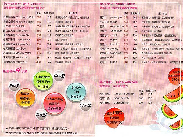 水果日記的MENU設計的頗有趣的, 像是"好像快感冒" $80, 以補充維他命C為主的果汁; "不想當姊姊" $100 果汁特性以美容養顏抗衰老為主。挺有趣也挺有道理的設計, 有空就來店裡跟店員聊聊, 親切的店員會給你不錯的建議喔!