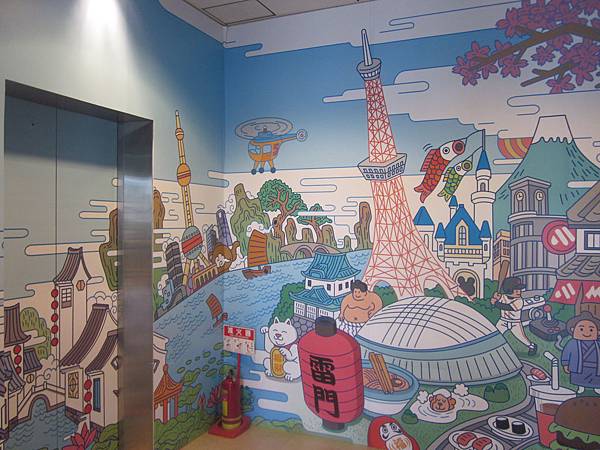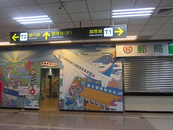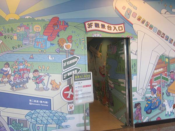 在第一航廈與第二航廈間的聯絡通道, 郵局旁邊, 就看到一面超可愛的彩繪牆面, 由此小小的門進入搭乘電梯到三樓觀景台。