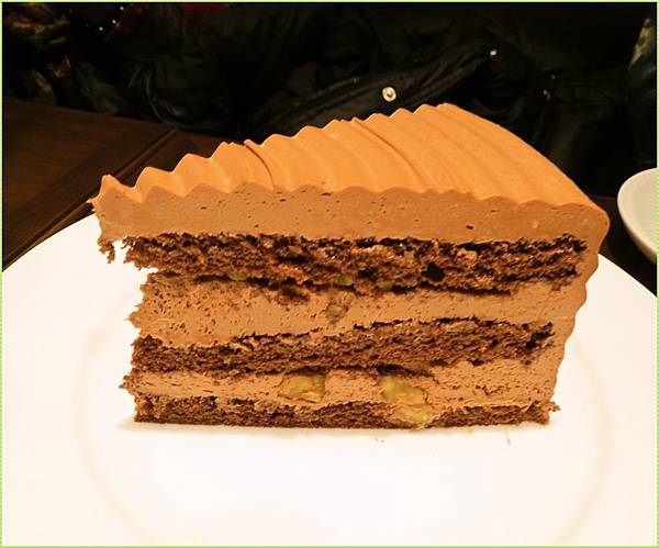 巧克力蛋糕。巧克力海綿蛋糕中還夾有核桃顆粒,讓口感更好。