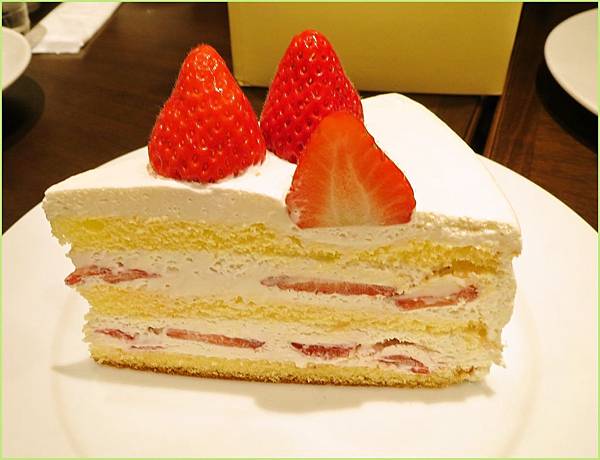 草莓蛋糕。不只蛋糕上超大顆草莓,海綿蛋糕中間夾層也鋪滿草莓切片與鮮奶油,很爽口不會甜膩。