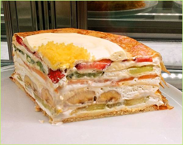 六層可麗餅,中間放的都是新鮮水果,平常不愛吃水果蛋糕的我,吃了一口驚為天人,返台後還念念不忘這美味的蛋糕!