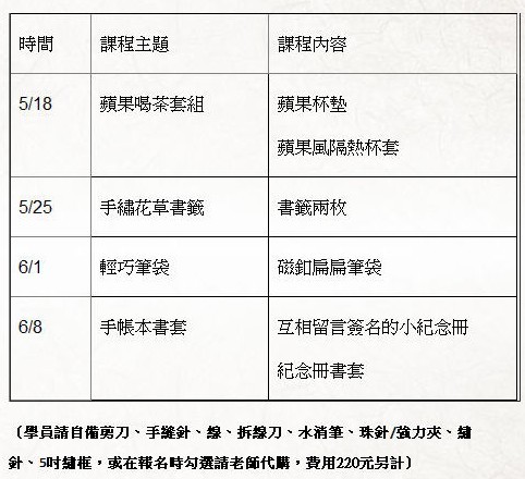 我還蠻喜歡手縫工藝,但就是手不巧,四堂課中除6/1那堂課請假去日本旅遊,倒也認真的完成四件作品。