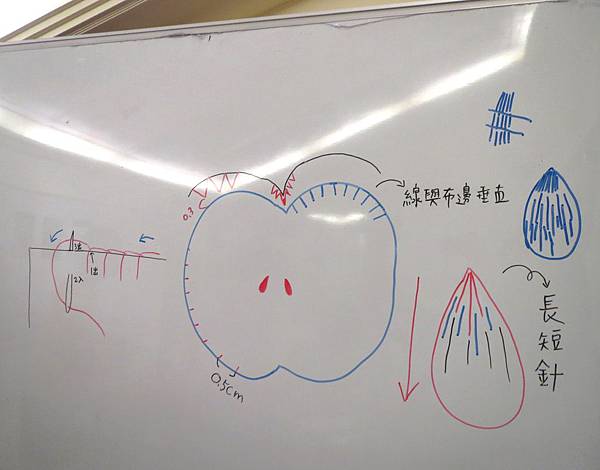 多虧國中的家政課都有認真上課繳交作業,縫的部分不難,果核部分原來是用長短針縫製而成。