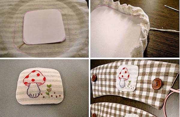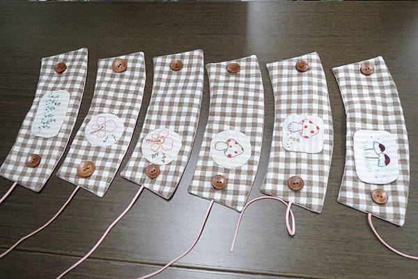 繡好圖案後將一紙板逢入布中包起,再固定在長布條上即完成。