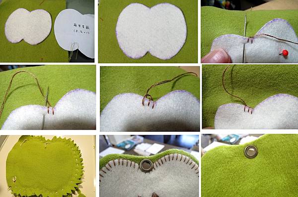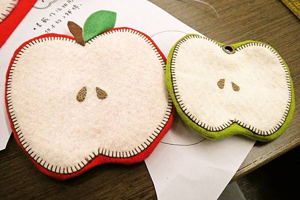 先將兩塊布剪出大蘋果跟小蘋果形狀,用水消筆在小蘋果布上畫出間距約0.5公分的點,再用毛邊縫將兩塊布縫在一起。縫到後面記得要留一個口,以便能將布翻面。要將蘋果周圍剪成鋸齒狀,這樣翻面後布才不會擠在一堆。