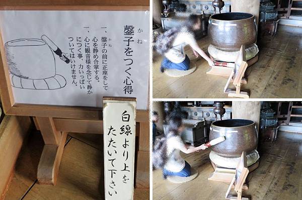 敲缽時要跪坐,合掌默念,然後拿起鐘槌敲缽的邊緣敲一下即可,心誠則靈。