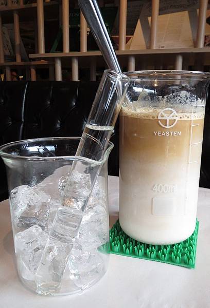 點了一杯冰拿鐵,端來一看處處是驚喜:咖啡裝在實驗室的燒杯裡,糖水則放在試管內,杯墊則是塑膠草皮!