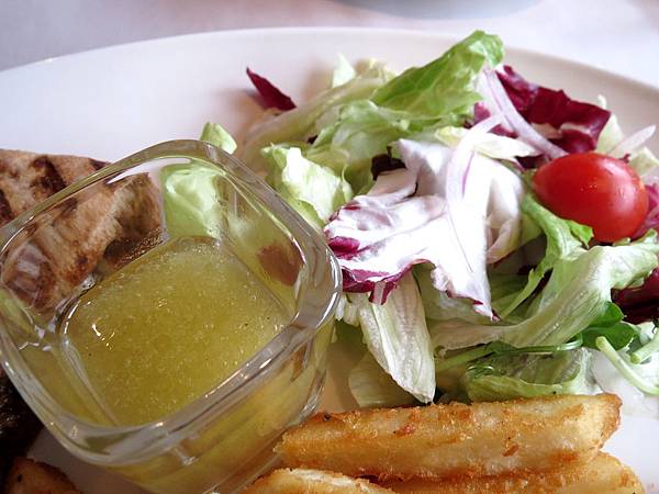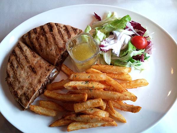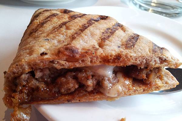 點了半份美式醬燒烤牛肉餅帕尼尼。份量不少,搭配生菜、薯條,加上厚實的帕尼尼,看來晚餐可省了。